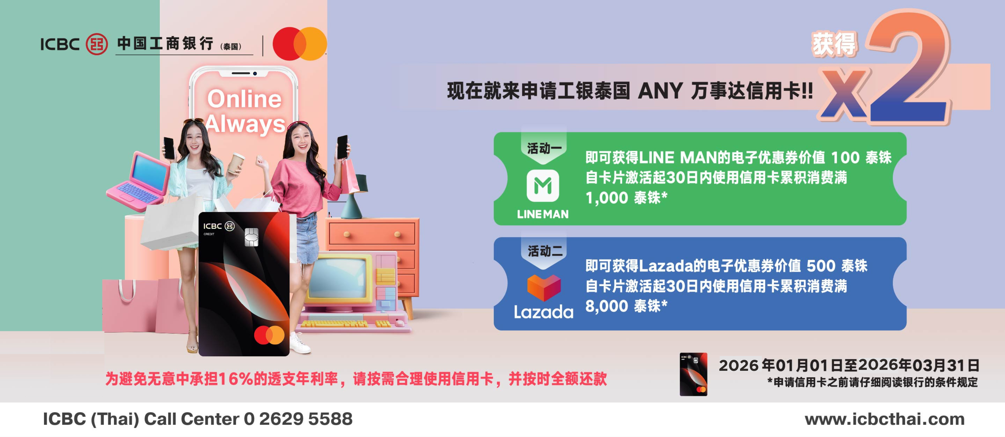 - 此活动只适用于在2026年01月01日至2026年03月31日期间新申请工银泰国ANY万事达信用卡的主卡及副卡持卡人,且持卡人必须在2026年05月15日前启用信用卡。