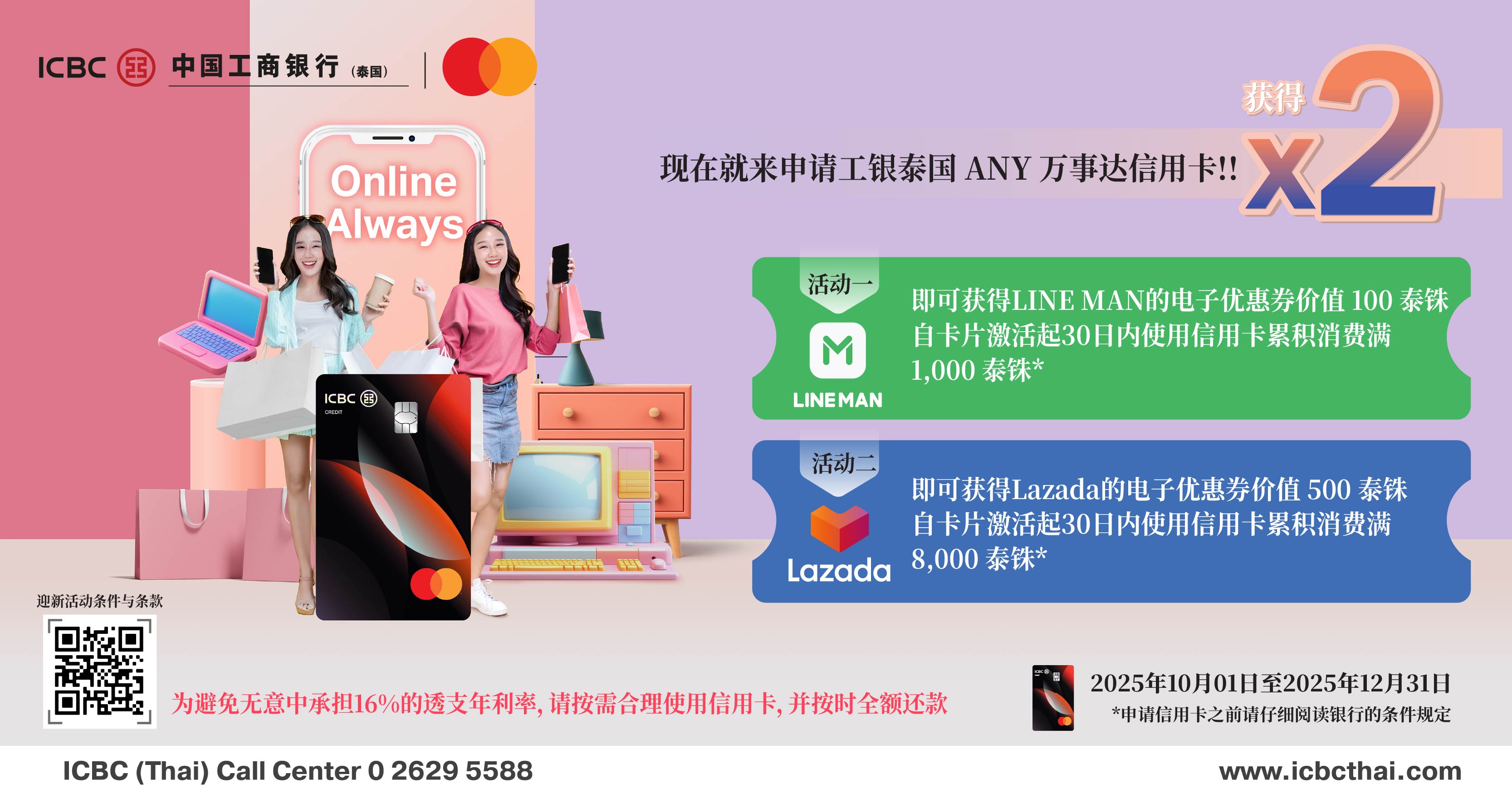 - 此活动只适用于在2025年10月01日至2025年12月31日期间新申请工银泰国ANY万事达信用卡的主卡及副卡持卡人,且持卡人必须在2026年02月15日前启用信用卡。