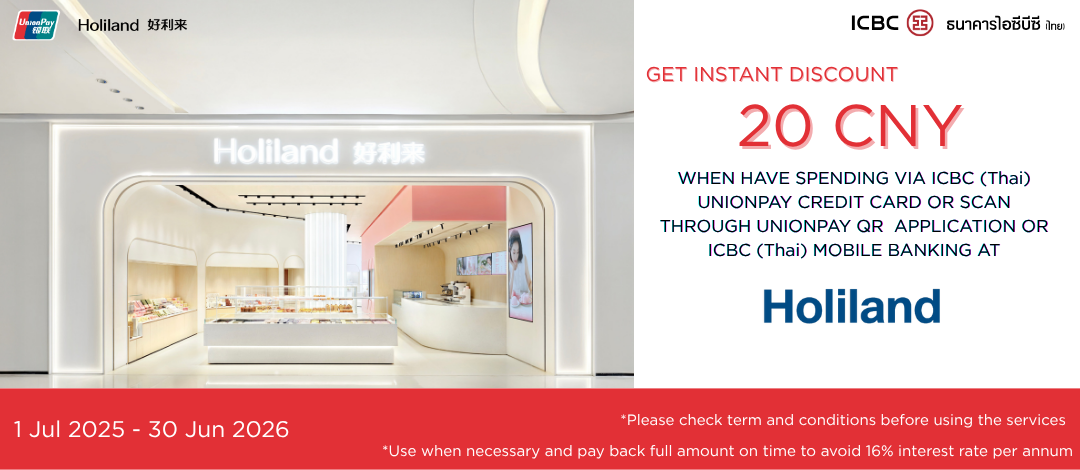 UPI x Holiland China: 使用工银泰国银联信用卡单笔消费或通过云闪付或工银泰国手机银行扫码支付满 100 元,即可立减 20 元 (即日起至2026年6月30日)