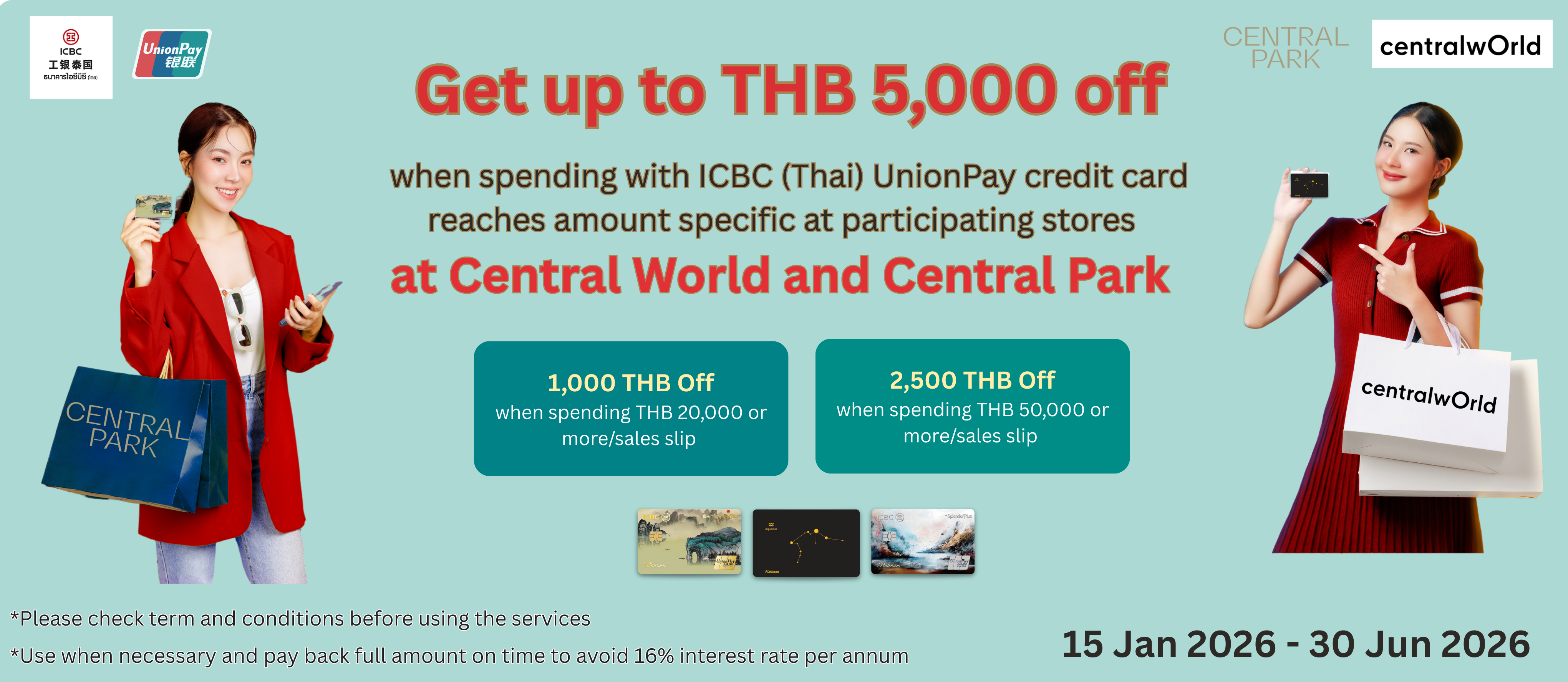 UPI×Central World和Central Park 专属优惠 在曼谷Central World和Central Park商场指定品牌门店,使用工商银行(泰国)银联信用卡消费达标,即享最高5,000泰铢折扣。(2026年1月15日至6月30日)
