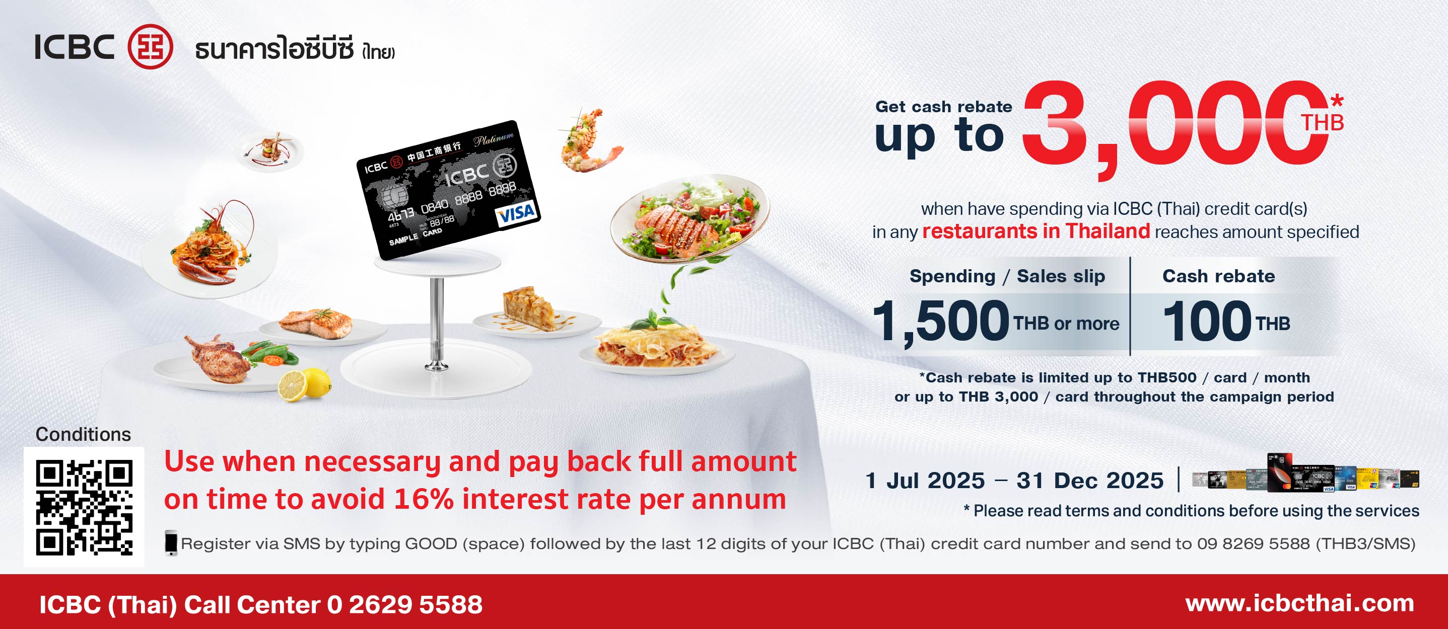 Dining: Get cash rebate up to THB3,000 when spending via ICBC (Thai) credit card as specified (1 Jul 2025 - 31 Dec 2025)