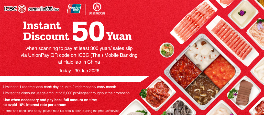 - ICBC (Thai) and UnionPay International Co., Ltd. reserves the right to amend any terms, conditions and/or benefits of this promotion with 7-day prior notice to the cardholders. In case of any disagreement or dispute, the decision of ICBC (Thai) and UnionPay International Co., Ltd. shall be final.