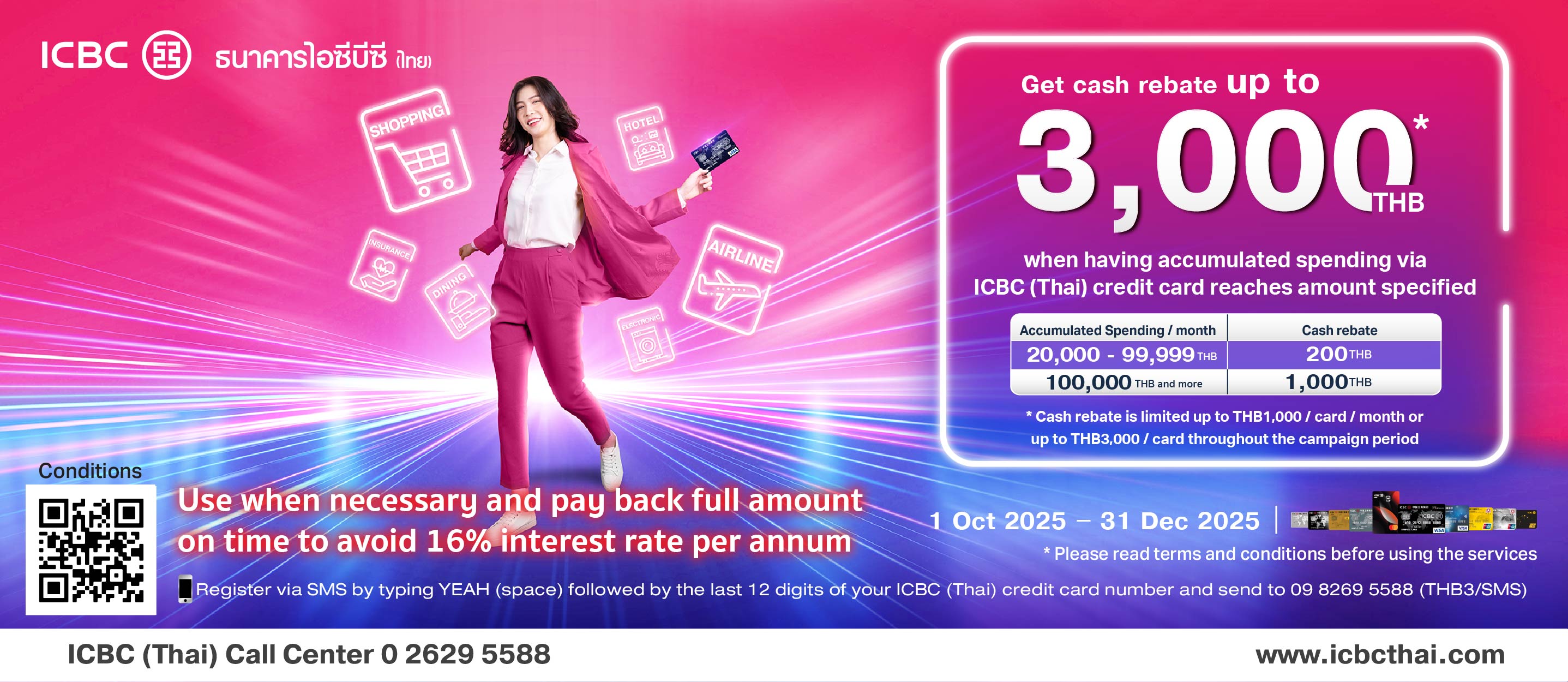 Get cash rebate up to THB 3,000 when have accumulative spending via ICBC (Thai) credit card reaches amount specified (1 Oct 2025 – 31 Dec 2025)