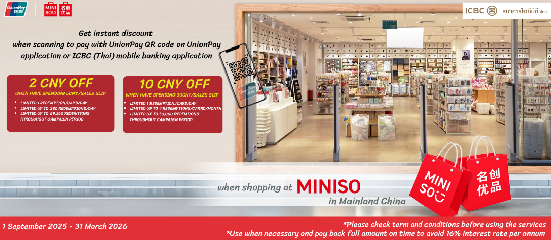 - ICBC (Thai) UnionPay credit cardholders get the promotion discount at Miniso shop in China Mainland when paying via UnionPay QR Code on UnionPay application or ICBC (Thai) mobile banking application that links ICBC (Thai) UnionPay credit card.