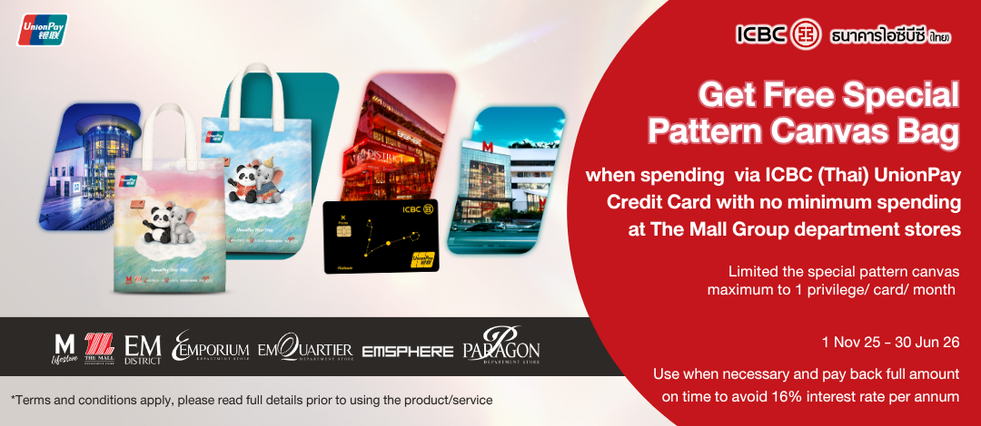 - ICBC (Thai) UnionPay credit cardholders get free special pattern Canvas Bag when spending via ICBC (Thai) UnionPay credit with no minimum spending at the Mall Group department stores, consisting of the Mall Lifestore and the Mall department stores, Emporium, Emquartier, Emsphere and Paragon department store (including Power Mall, Gourmet Market and Home Fresh Mart).