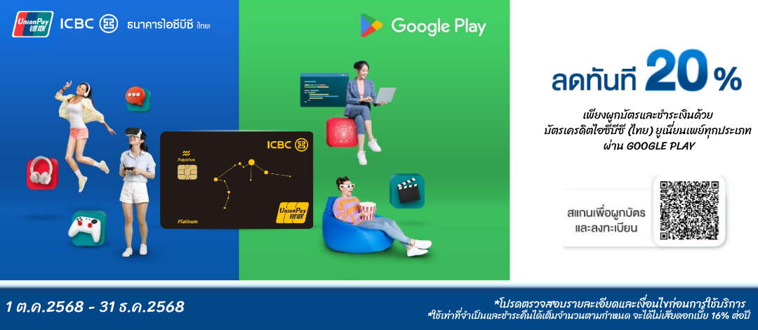 - สอบถามข้อมูลเพิ่มเติมได้ที่ฝ่ายบริการลูกค้ายูเนี่ยนเพย์ หมายเลขโทรศัพท์ 001 800 800 95516 หรือ Facebook “UnionPay International – Thailand” หรือ ธนาคารไอซีบีซี (ไทย) Call Center หมายเลขโทรศัพท์ 0 2629 5588 ในเวลาทำการ (จันทร์-ศุกร์ เวลา 8.30 – 21.00 น. หรือ วันเสาร์ อาทิตย์ และวันหยุดนักขัตฤกษ์ เวลา 8.30 – 17.00 น.)