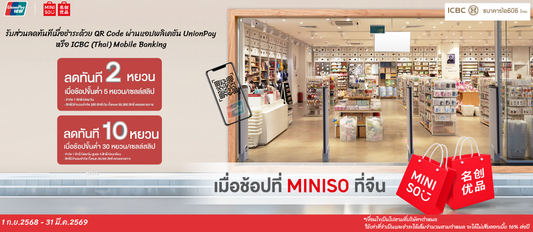 - ผู้ถือบัตรเครดิตธนาคารไอซีบีซี (ไทย) ยูเนี่ยนเพย์ รับส่วนลดตามโปรโมชั่นเมื่อชำระเงินด้วย UnionPay QR code ผ่านแอปพลิเคชันยูเนี่ยนเพย์ หรือ แอปพลิเคชัน ICBC (Thai) Mobile Banking ที่ผูกกับบัตรเครดิตธนาคารไอซีบีซี (ไทย) ยูเนี่ยนเพย์ ณ ร้าน Miniso ประเทศจีน แผ่นดืนใหญ่ เท่านั้น