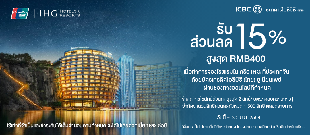 - ผู้ถือบัตรเครดิตธนาคารไอซีบีซี (ไทย) ยูเนี่ยนเพย์รับส่วนลด 15% สูงสุดไม่เกิน 400 หยวน เมื่อทำการจองโรงแรมในเครือ IHG ที่ประเทศจีนด้วยบัตรเครดิตไอซีบีซี (ไทย) ยูเนี่ยนเพย์ผ่านช่องทางออนไลน์ที่กำหนดดังต่อไปนี้: เว็บไซต์ทางการของ IHG, โปรแกรม WeChat Mini ของ IHG One Rewards และแอปพลิเคชัน IHG